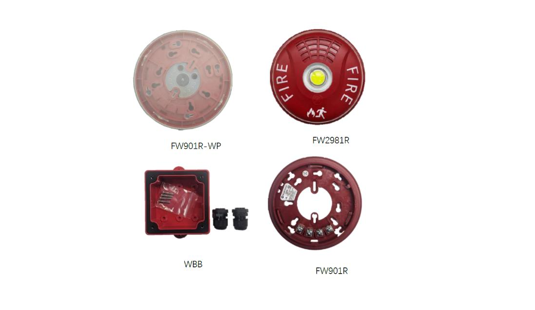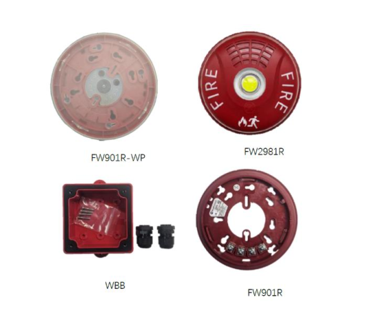 The UL-approved FW2981R series strobe features 6-level adjustable light intensity(15-177cd,22-186mA),field-adjustable via FW2411(15cd default). Pair with optional FW901R-WP(UL base +seal,press-fit adhesive)&UL-isted WBB(fittings included)for IP55(TUV-verified).